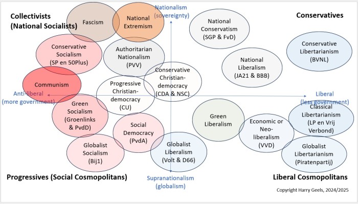 Determine your place in the coordinate system and you will see more clearly which parties suit you or, conversely, do not suit you at all. If you consider your own culture and limited government to be important, you will end up in the upper right quadrant of the “conservatives”. If you feel like a liberal global citizen, you will be in the lower right quadrant, among the “liberal cosmopolitans”. If you want a regulating (redistributive) government and are nationalistic, you will be in the quadrant of the “collectivists”. At the bottom left, we find the “progressives”.
