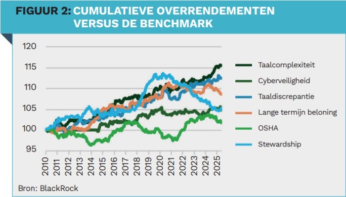 The analysis shows that strategies with good governance indicators demonstrate improvement in both financial and governance areas. For example, higher language complexity in earnings calls is associated with lower future profitability, while simpler language signals a more positive outlook. The model achieves an Information Ratio (IR) of approximately 1.22 for the Russell 3000 and 0.8 for the MSCI World. In addition, lower complexity correlates with better governance indicators, such as higher MSCI Governance Controversy Scores (0.10 improvement versus the benchmark) and better Audit Tax Risk Management scores, indicating a more favourable sustainability profile. The indicators may have dual materiality that could be interesting for inclusion strategies.