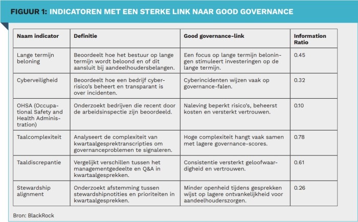 In the context of double materiality, good governance is therefore twofold: on the one hand, it influences financial performance, and on the other, it determines the extent to which a company has a negative or positive impact on people and society. The structural inclusion of governance indicators in investment analyses enables investors to make informed choices that support both. Our research therefore focuses on indicators with a strong link to good governance (Figure 1). We look at the MSCI World (except for OHSA, where we only consider US equities) for the period between 2010 and 2025, and use (sustainability) annual reports, policy documents, website data, language signals, machine learning and earnings transcripts.