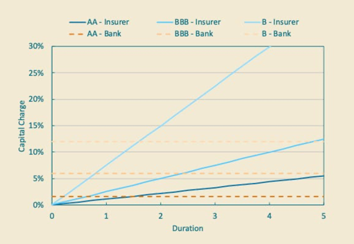 The result: for loans with a maturity of up to three to four years, an insurer may actually have more room on its balance sheet than a bank. For very long-term loans, the capital requirement increases again.