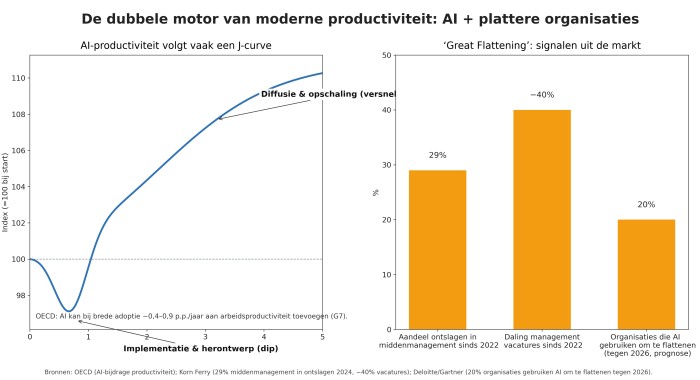 After years of grumbling about “stagnation”, we are finally seeing productivity growth again. In the US, labour productivity rose by 2.3% in 2024 (after +1.6% in 2023). This is no coincidence. Two movements are intertwined: AI that speeds up routine tasks and supports decision-making, and flatter organisations. The best empirical estimates place AI's structural contribution to (labour) productivity at approximately 0.4–0.9 percentage points per year once adoption becomes widespread, provided that companies redesign their structure accordingly.
