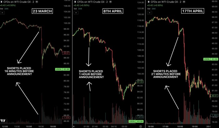 In recent weeks, large short positions in oil (WTI) have been taken just ahead of major geopolitical news. On 23 March, a $500 million short position was taken, fifteen minutes before Trump announced he would delay the attacks on Iran. On 7 April, $950 million worth of short positions were taken, an hour before Trump announced the ceasefire between the US and Iran. And on 17 April, $760 million worth of short positions were taken, twenty minutes before Iran declared it would reopen the Strait of Hormuz.